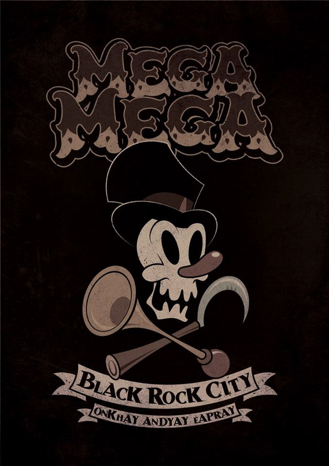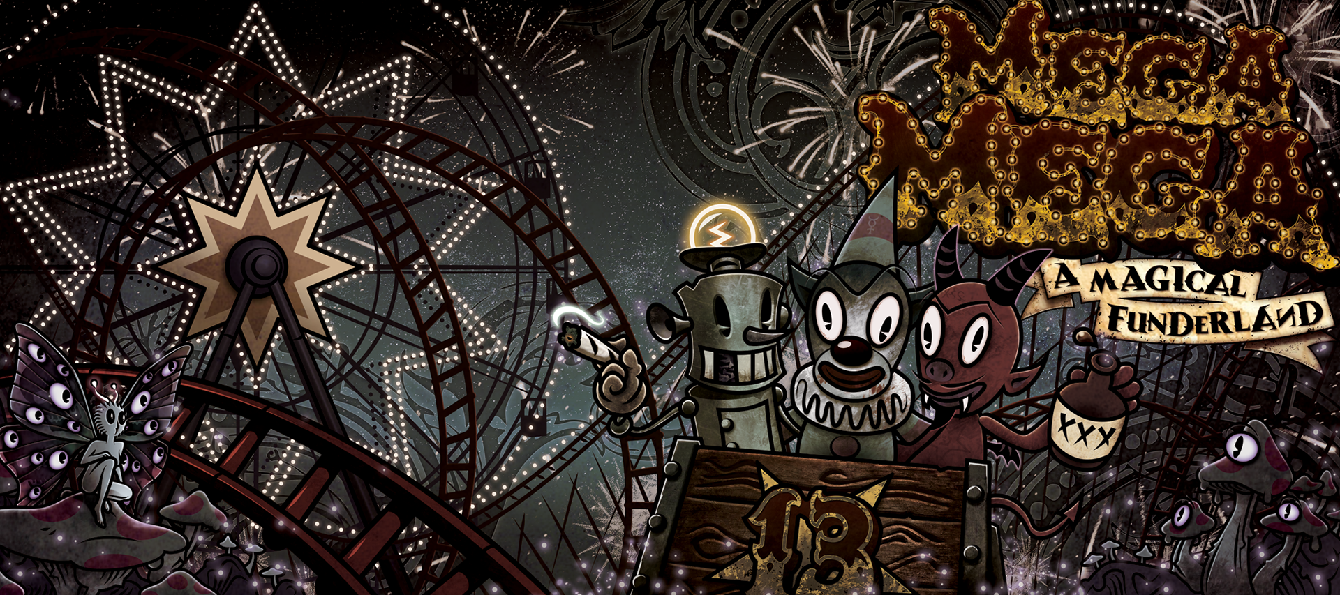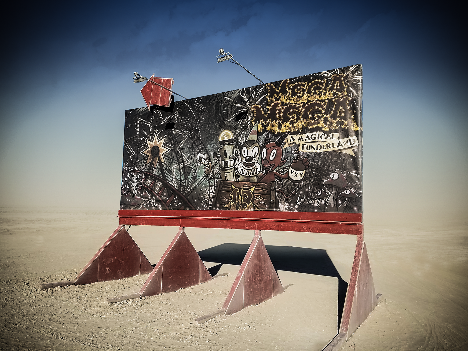 Mega Mega. Honorarium Grant Recipient at Burning Man 2019. This was a billboard in the middle of nowhere pointing to an imaginary amusement park. The theme was 1930's vintage, low brow, fringe culture, and tricksters. Created in Affinity Designer and Photoshop.