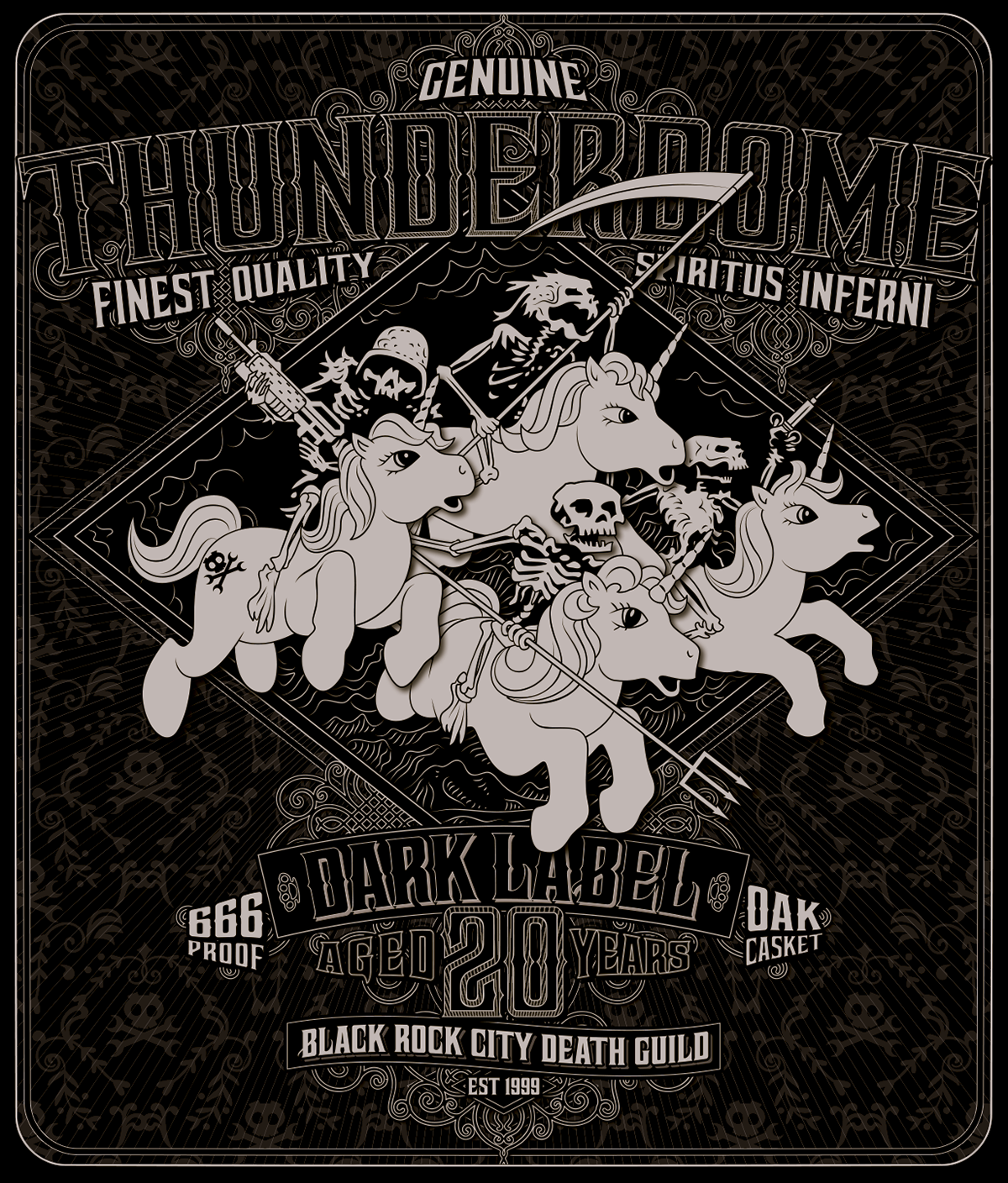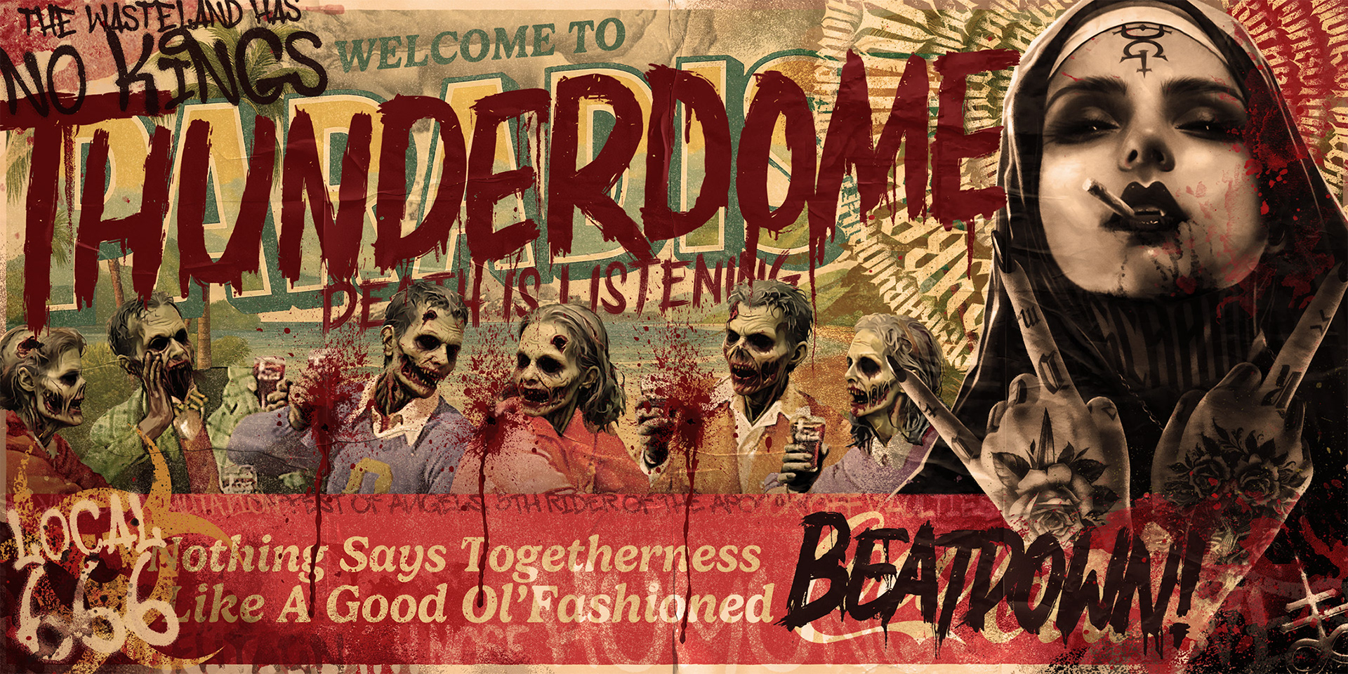Death Guild Thunderdome. Billboard design for front of camp. Concept: defaced and graffitied billboards from a post apocalyptic setting inspired by the Mad Max films. Also showcased at the Wasteland Weekend event. Created in Affinity Designer and Photoshop.