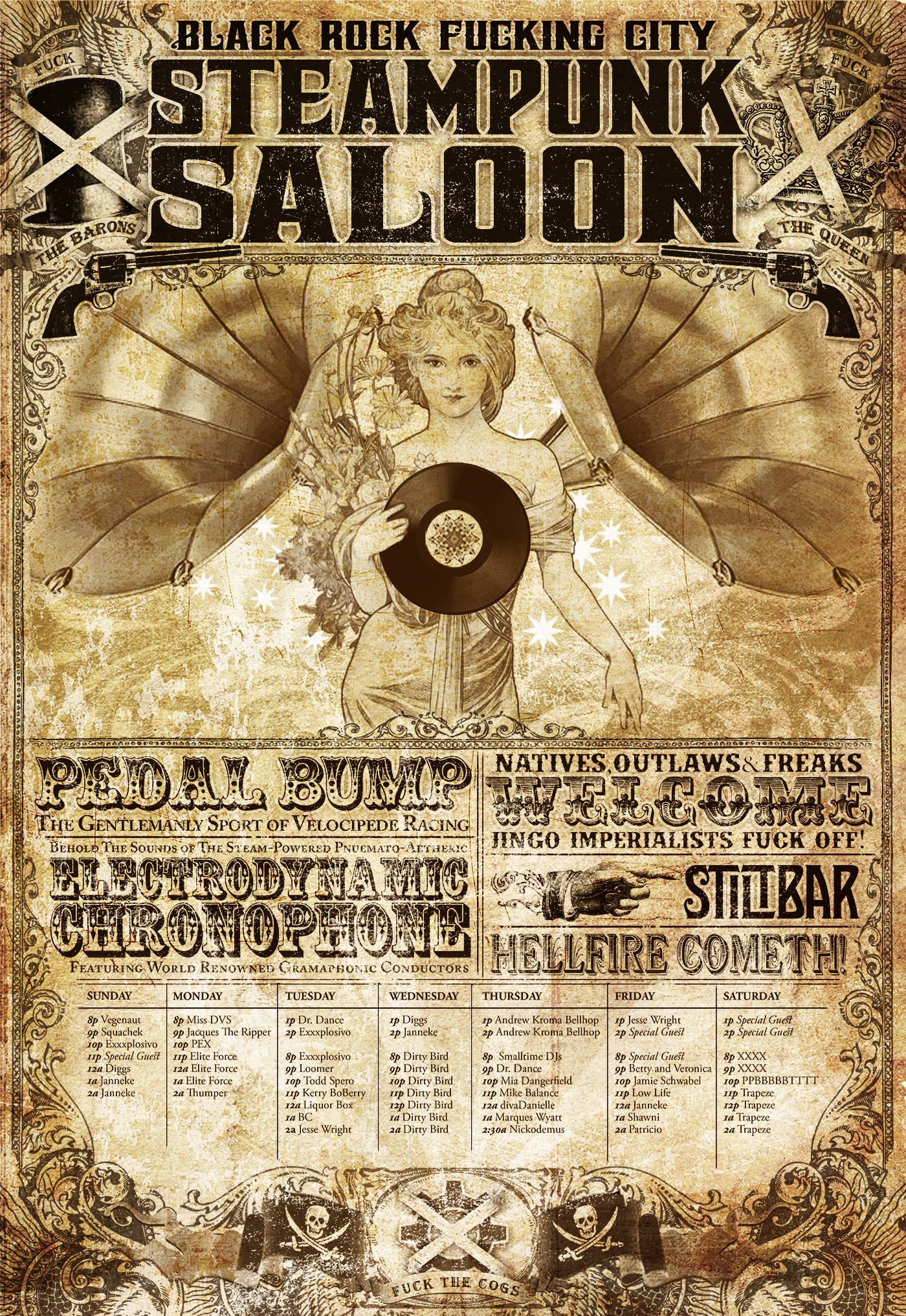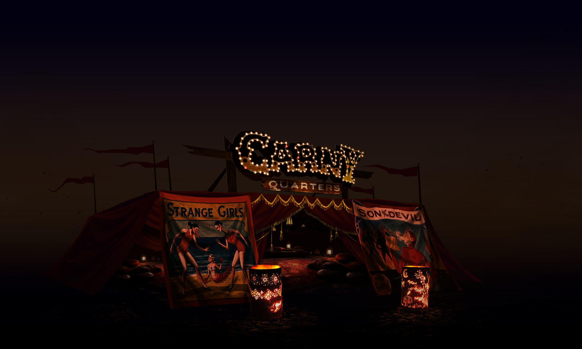 Carny Quarters, Burning Man 2025. An installation on the A Street side of The Red Nose District. Conceived as a back alley after hours hang out spot for clowns, circus performers, freaks and carnies. This was the test run of the piece. Inclement weather conditions presented challenges to full completion, but it was well received and successful none the less. We will come back stronger and more fully complete in 2026. Concept art below.