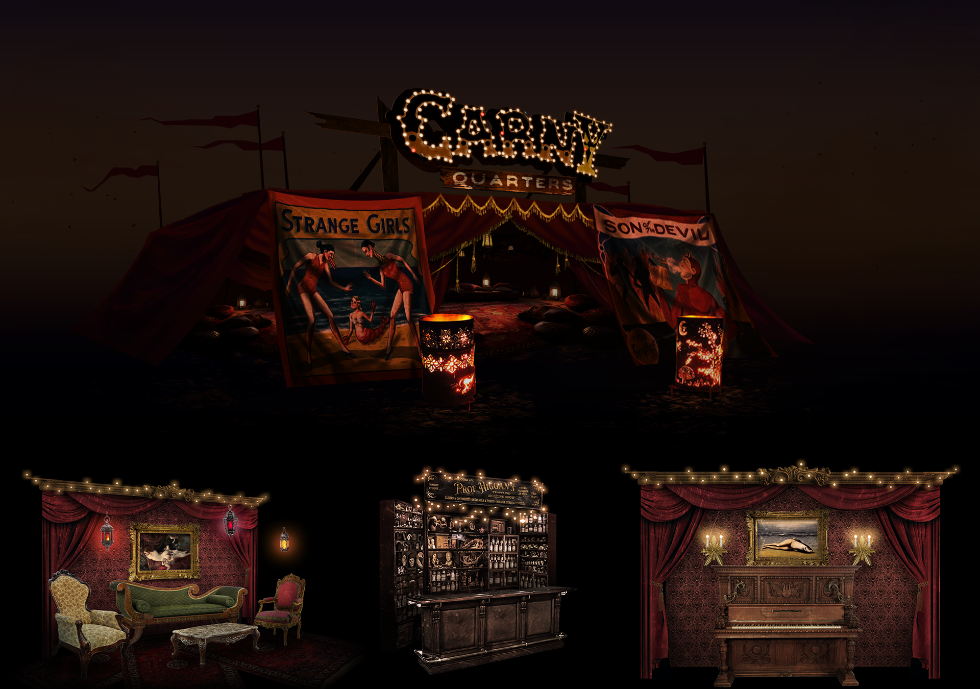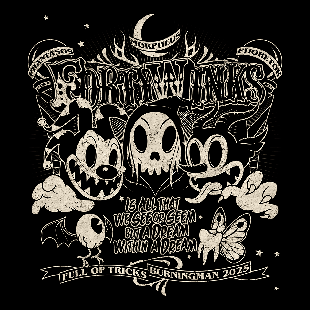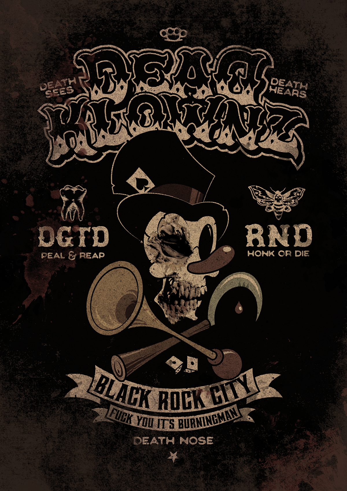 is circus inspired art collective that takes part in Burningman festival. The first four pieces were featured on posters, stickers and apparel. The last image is some rough concept design work. Affinity Designer, Photoshop.